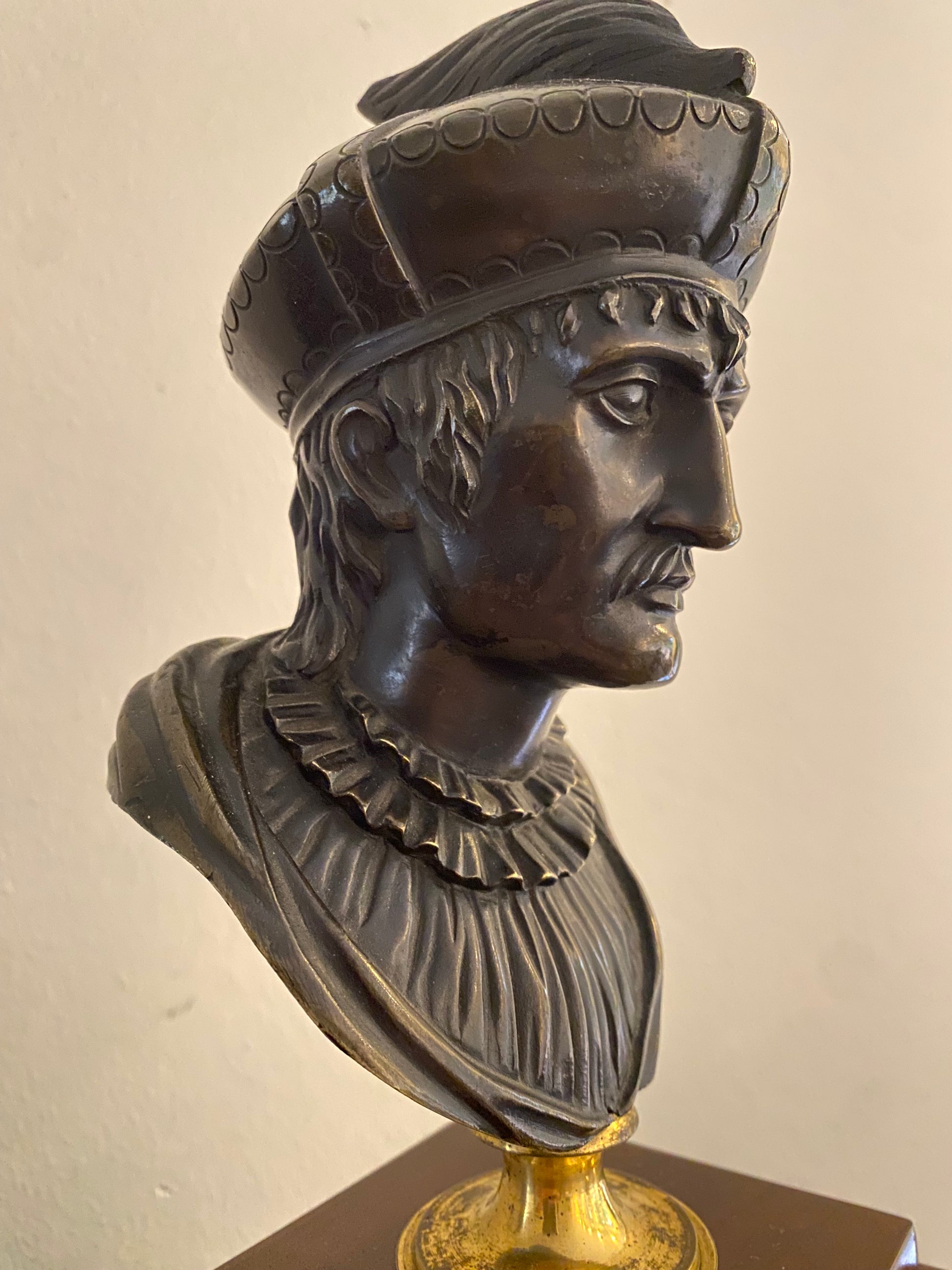 Een paar bronzen bustes op houten sokkels gefineerd met cuba mahonie.