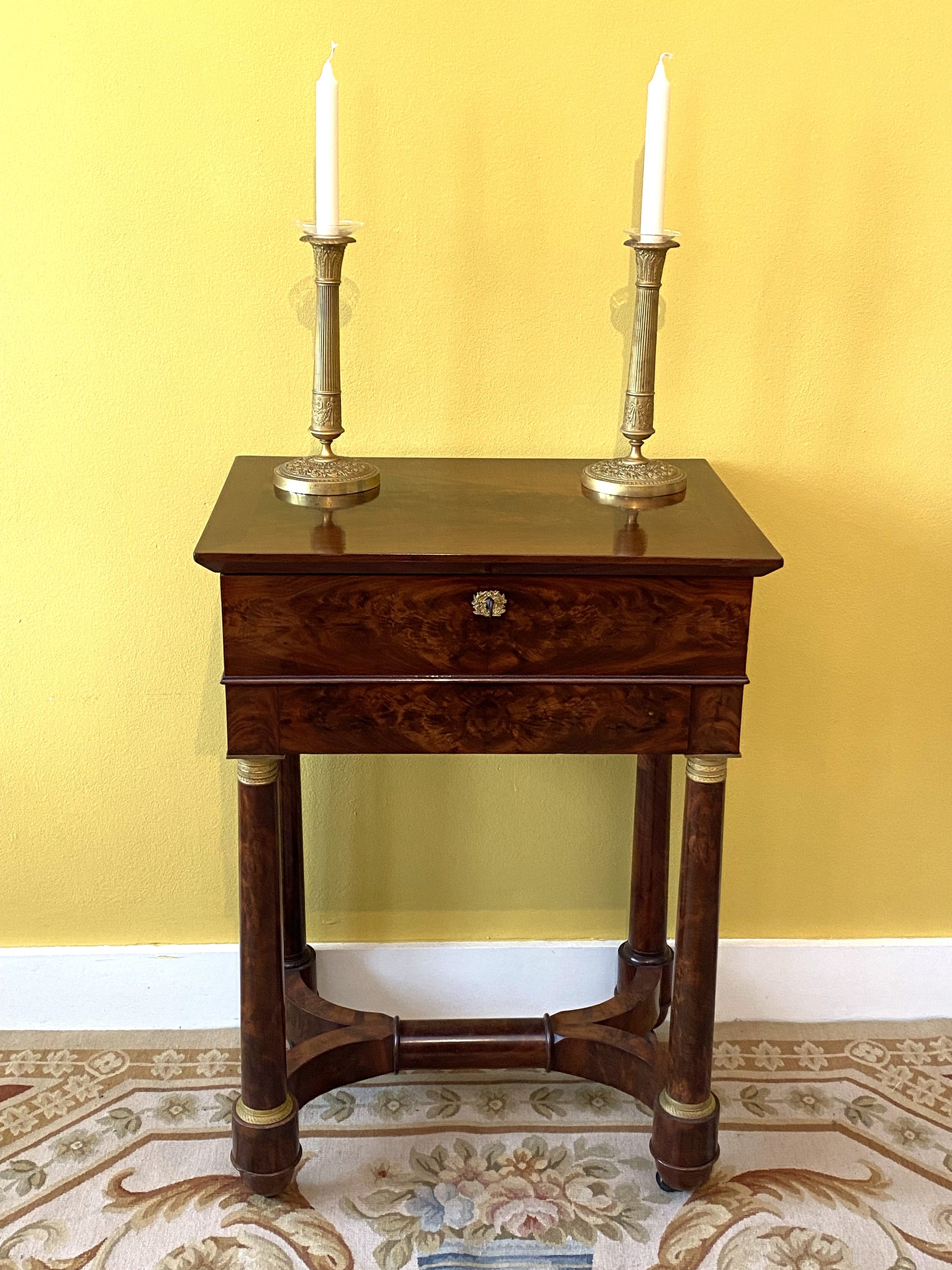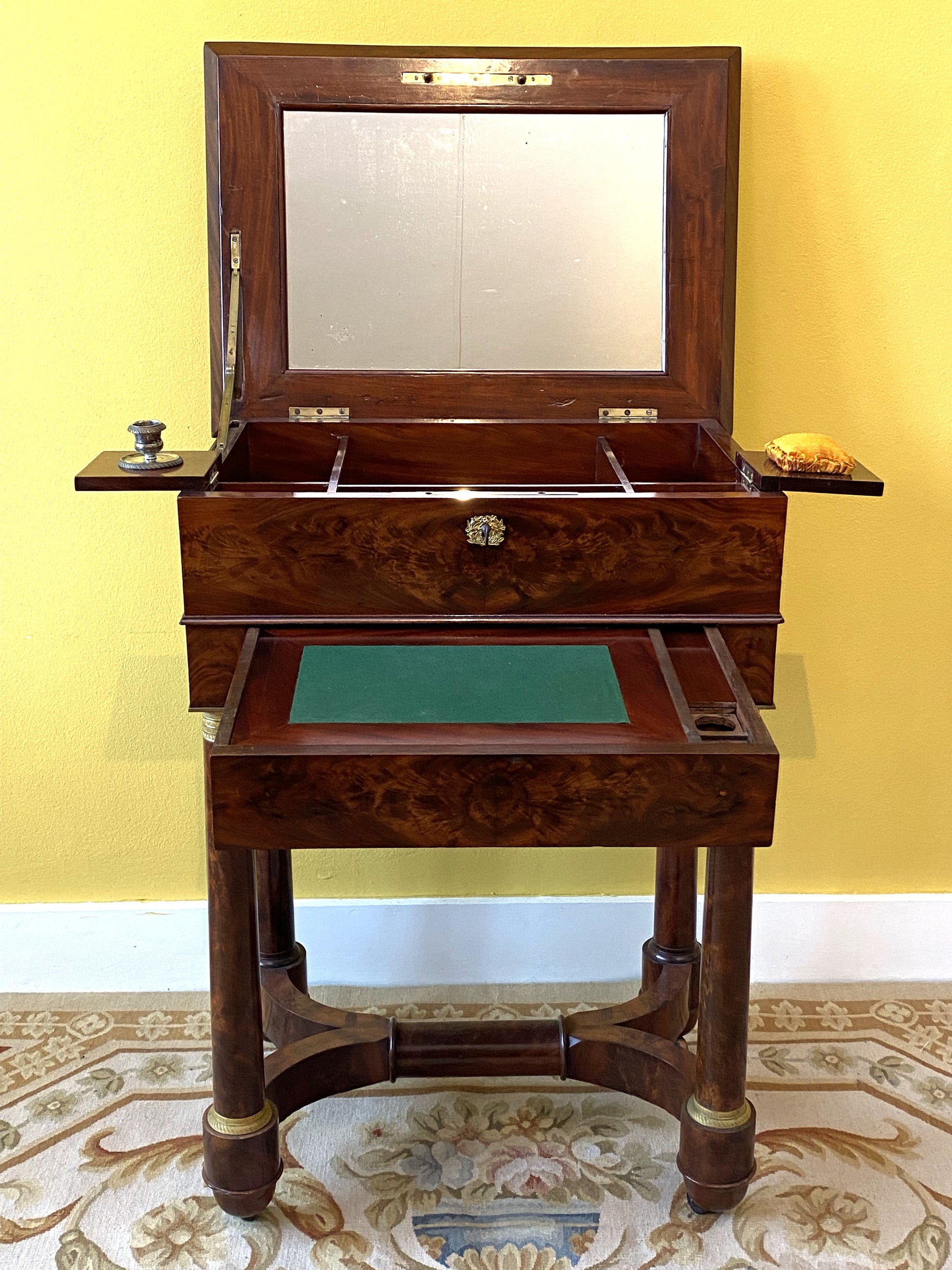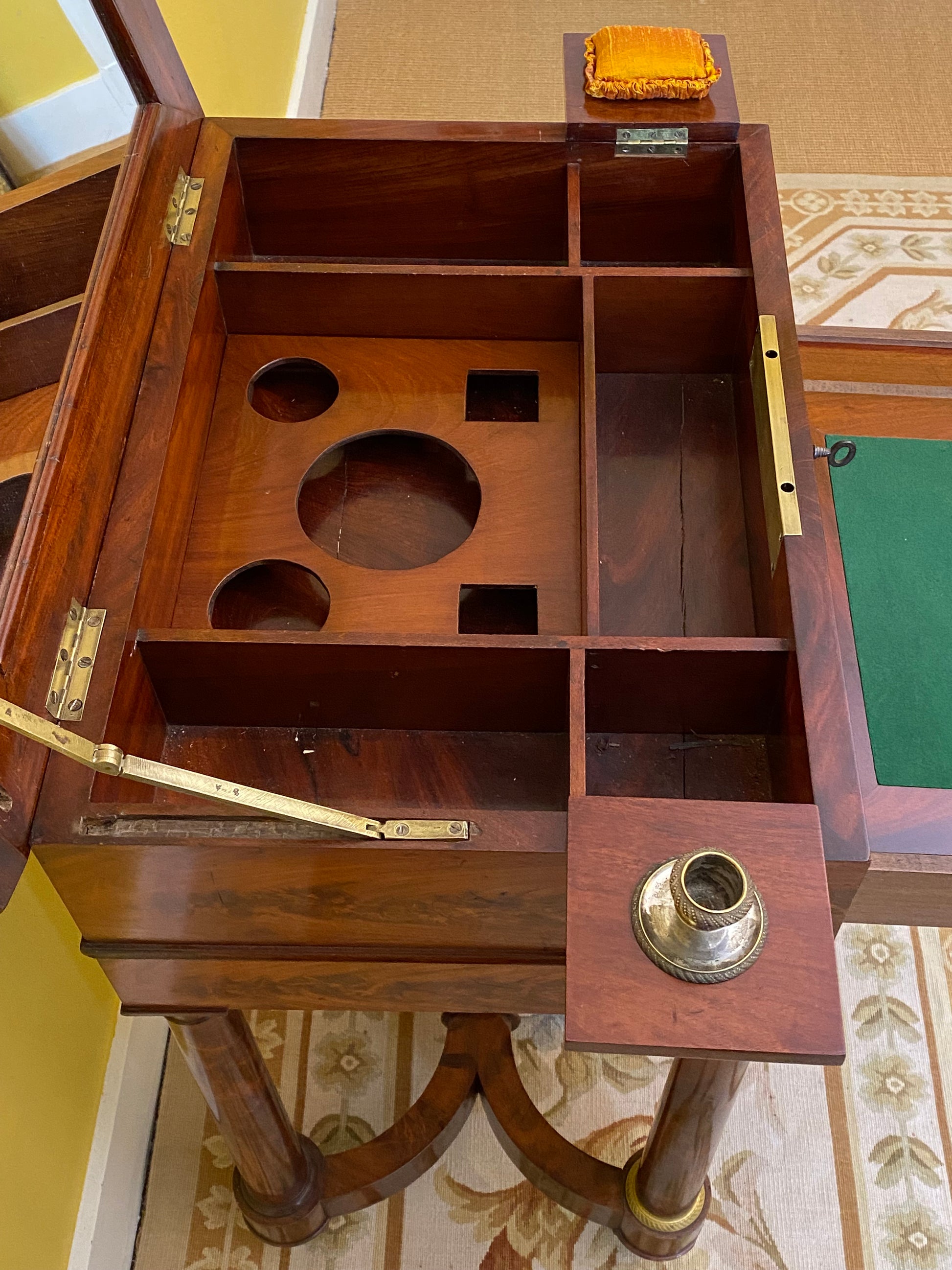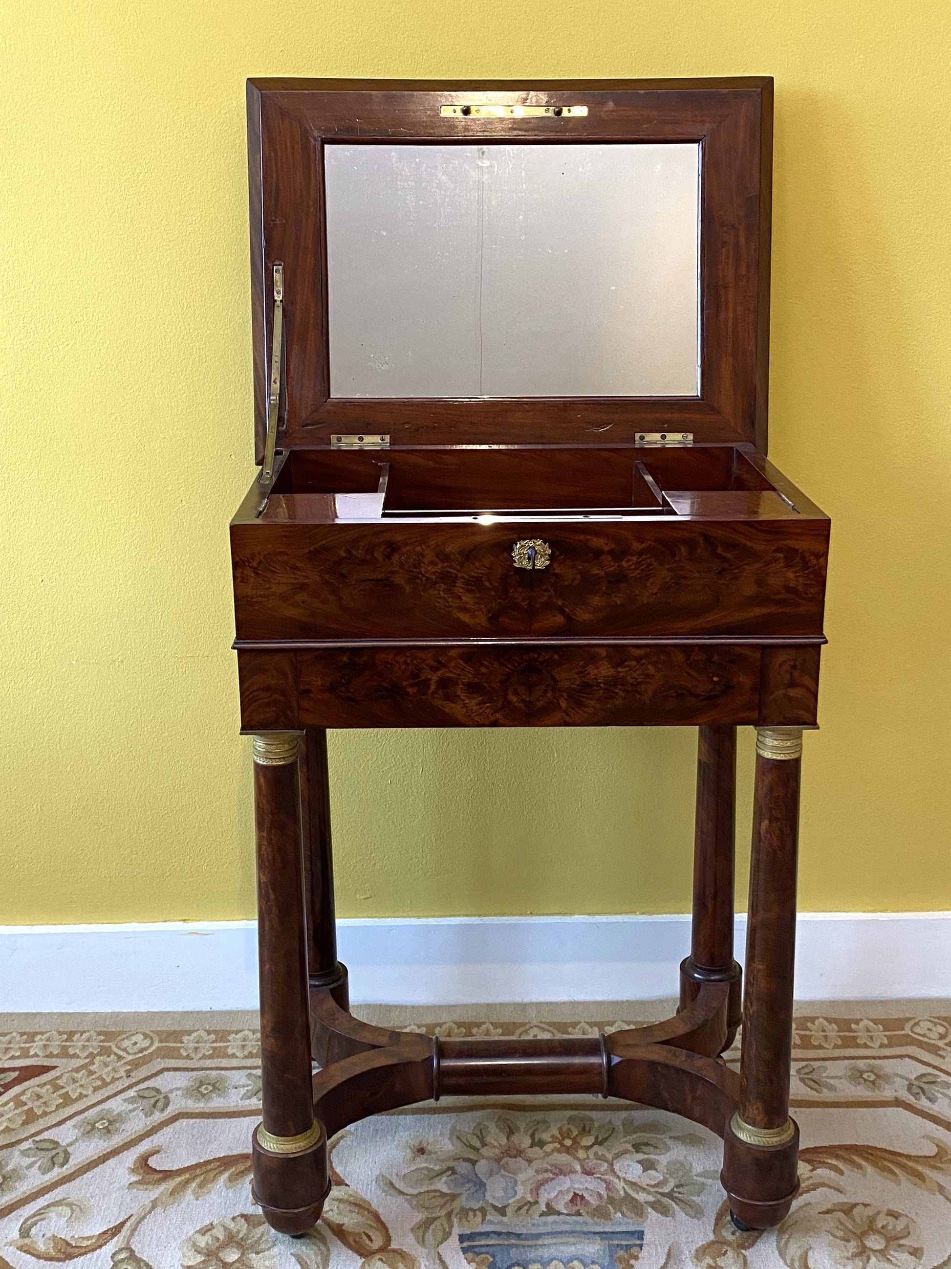 Naai-/werktafeltje met opklapbaar blad, aan de binnenzijde voorzien van een spiegel. Het interieur voorzien van een vakindeling en een uitklapbare speldenkussen en kaarshouder. Hieronder een lade met een schuifbaar schrijfblad. Op vier ronde kolompoten met zwenkwieltjes met bronzen vuurvergulde geciseleerde monturen aan de voorzijde.