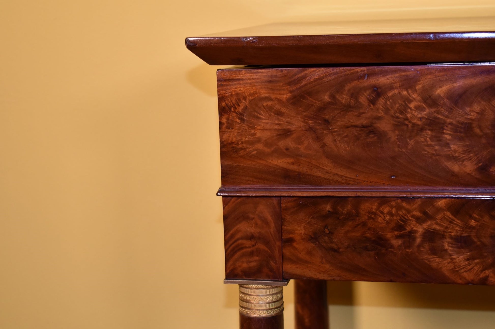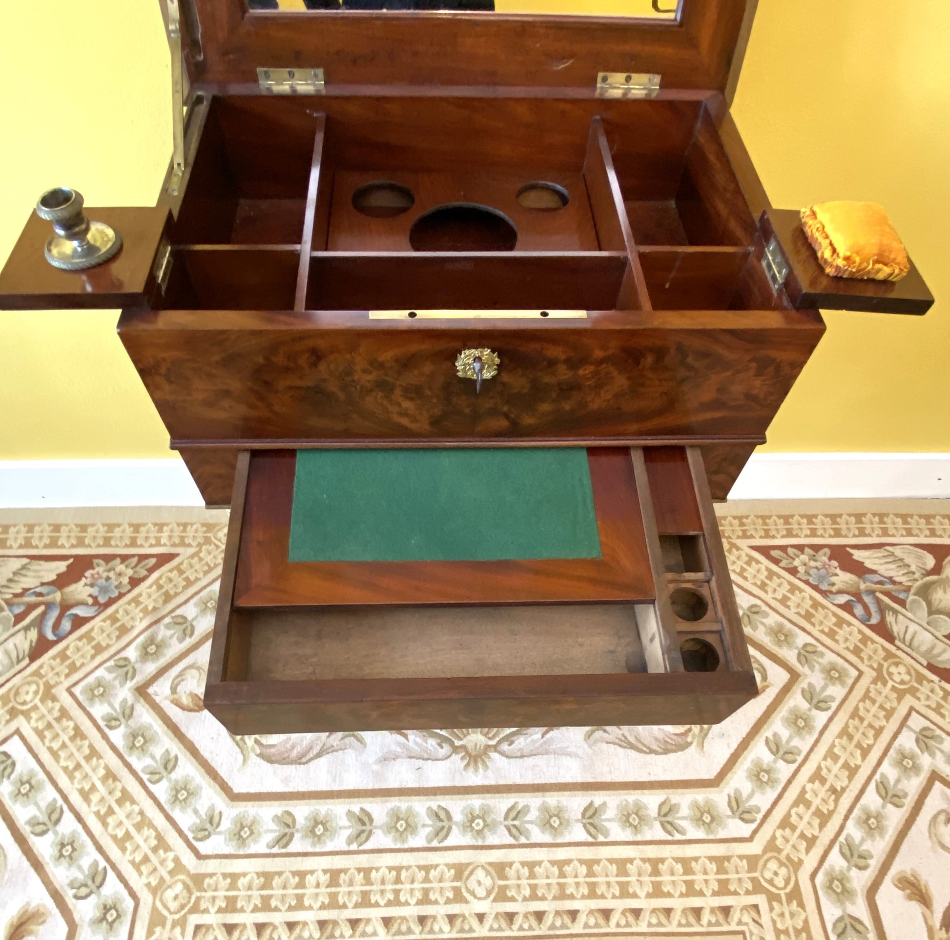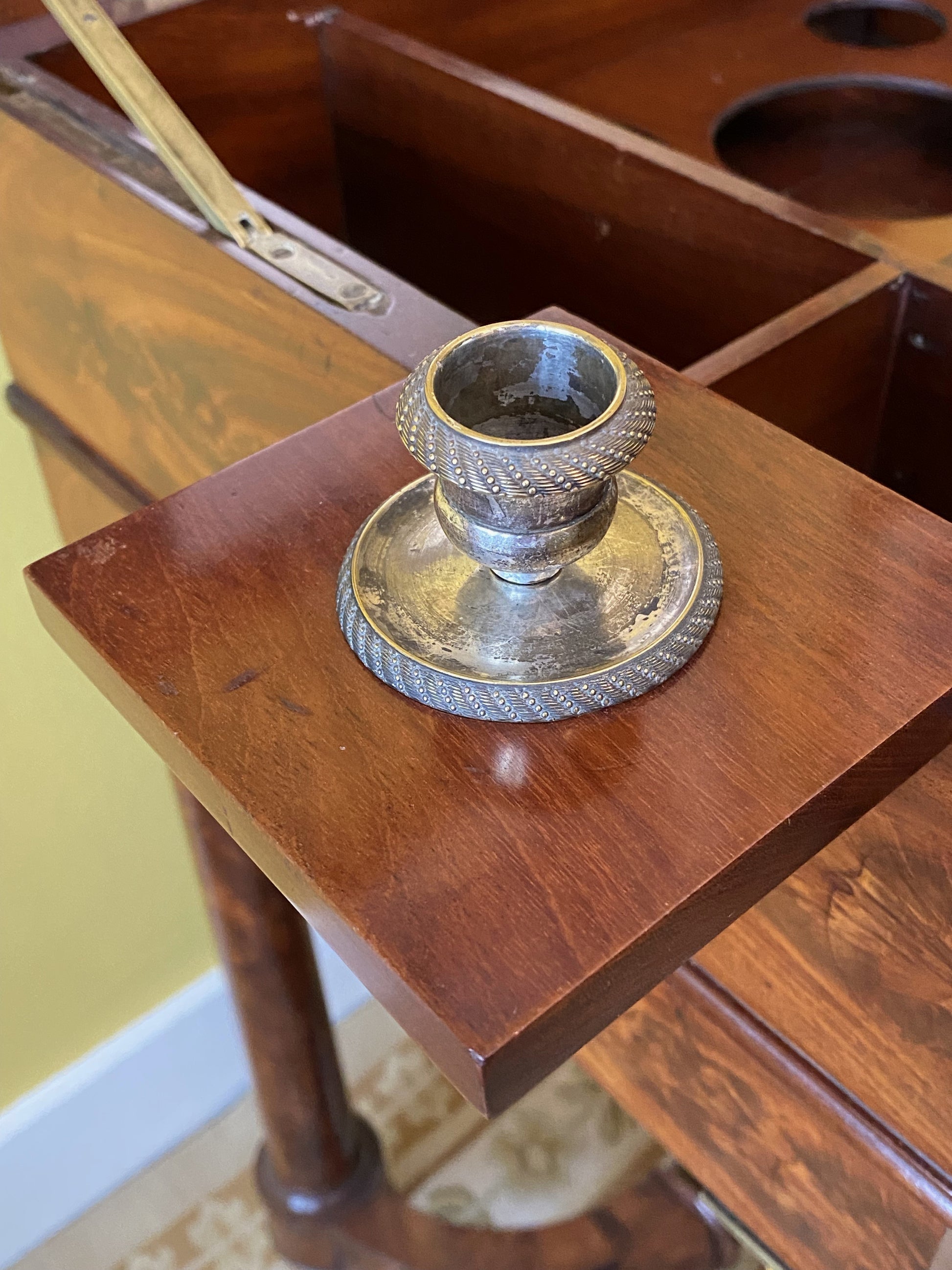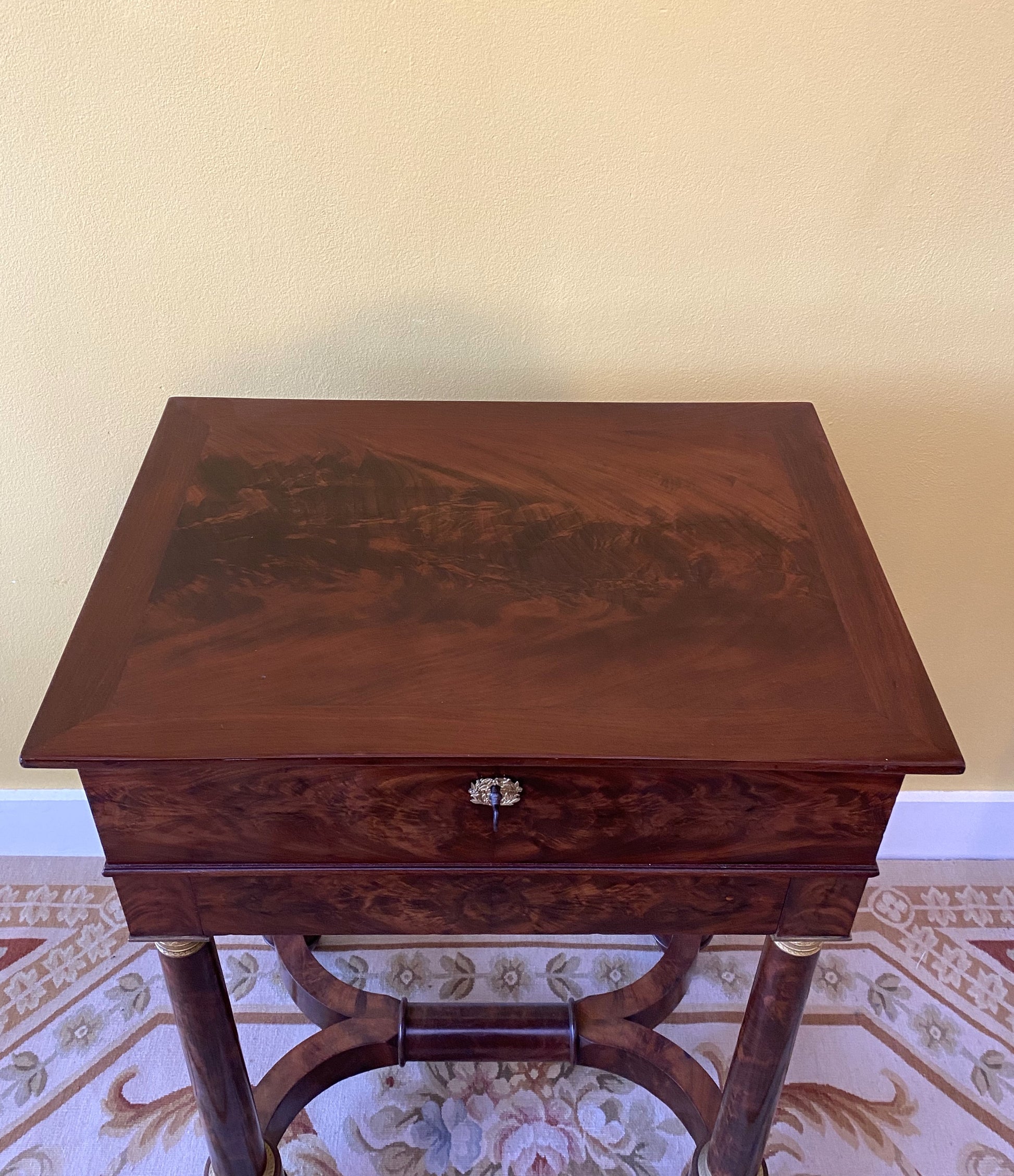 Naai-/werktafeltje met opklapbaar blad, aan de binnenzijde voorzien van een spiegel. Het interieur voorzien van een vakindeling en een uitklapbare speldenkussen en kaarshouder. Hieronder een lade met een schuifbaar schrijfblad. Op vier ronde kolompoten met zwenkwieltjes met bronzen vuurvergulde geciseleerde monturen aan de voorzijde.